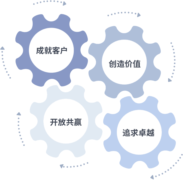 成就客户是一切决策的出发点,,,创造价值是衡量所有工作的标准,,,追求卓越是我们做事做人的态度,,开放共赢是我们的格局也是最终的结果。。价值观的齿轮环环相扣,,推动着组织里的每个人不断向前。。。。