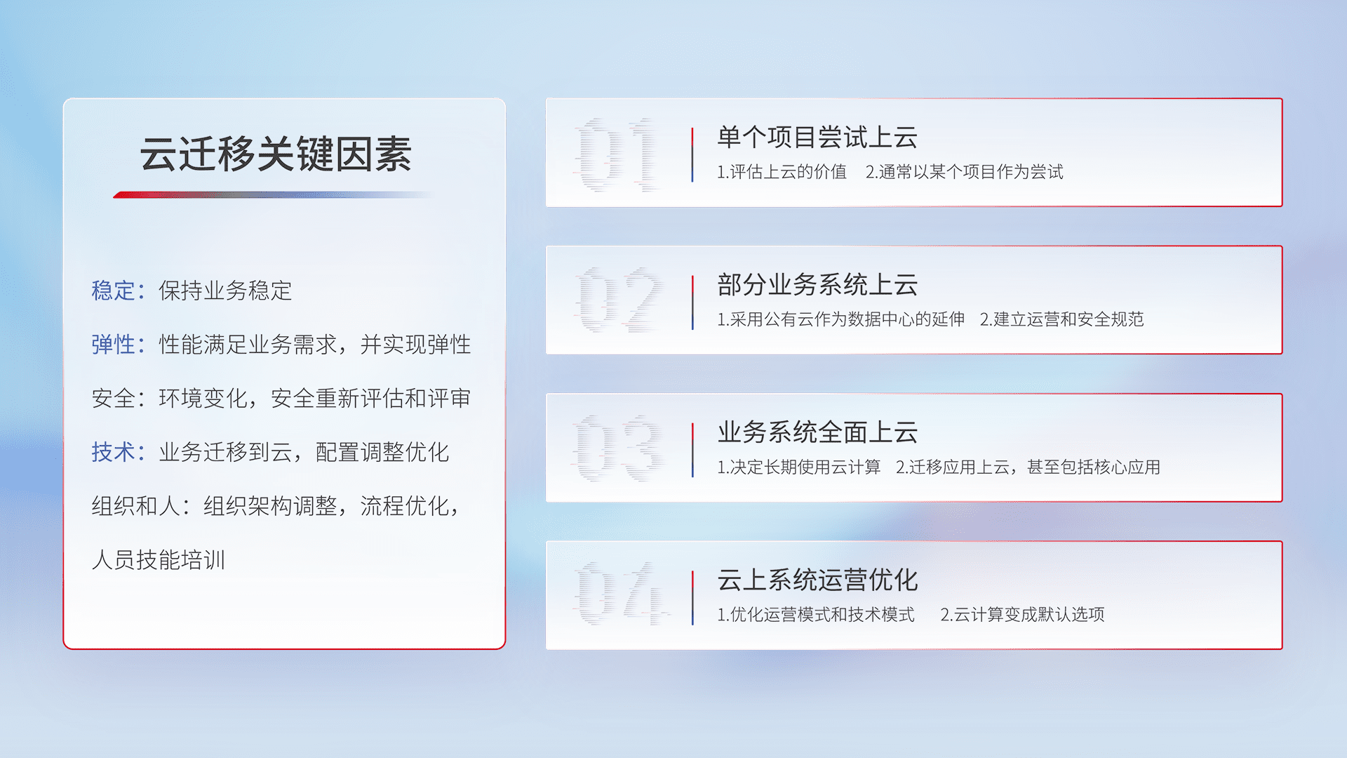 结合实际业务,,从规划设计、、、、云平台选型、、、、云原生改造、、、、数据迁移、、、集成交付,,,,迁移全过程为客户识别最佳上云路径,,做好风险识别管理,,,设计网络架构、、、身份权限、、安全审计合规、、、、操作审计、、日志审计、、监控告警策略、、、、多站点容灾设计等,,,,对云上基础设施进行整体规划,,,,提升IT治理水平,,以满足弹性、、、高可用、、、高性能的需求。。。。